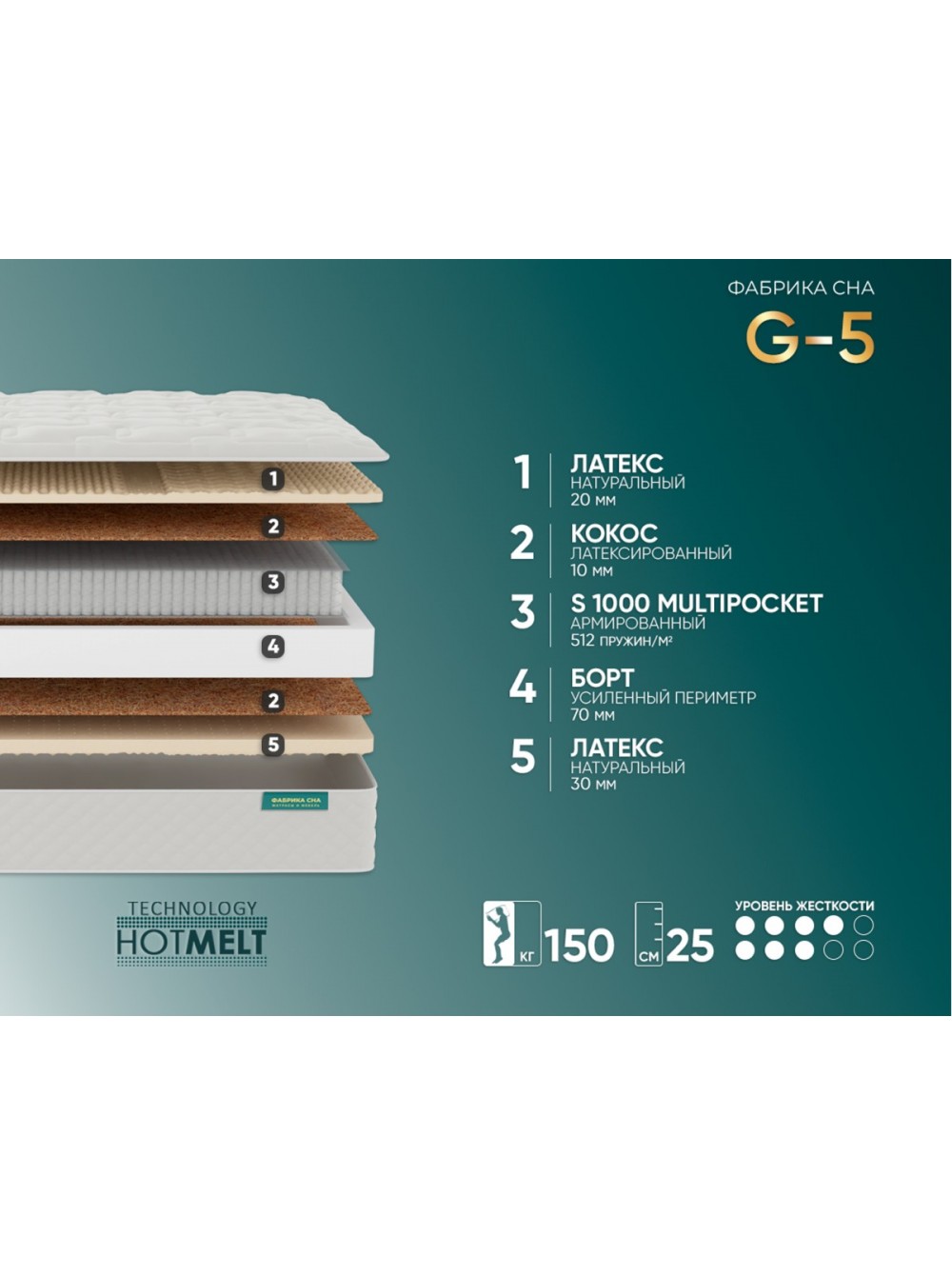 Матрас способствует идеальной поддержке всего тела благодаря сочетанию слоев натурального латекса и кокосовой койры с премиальным независимым пружинным блоком Multipocket S1000.